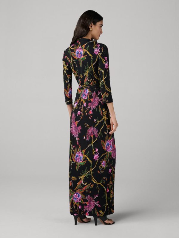 The Abigail Maxi returns in smooth matte jersey, featuring a striking botanical print accented with sequin and bead embellishments.